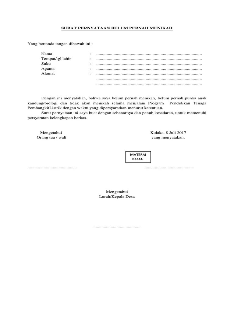 Pastikan di sana tersedia posisi yang sesuai dengan keahlian dan bidang studi anda agar lebih layak terima. Surat pernyataan sendiri memiliki beberapa jenis, seperti surat pernyataan kerja, surat pernyataan kesanggupan, surat pernyataan belum menikah, dan masih banyak lagi yang lain. Surat pernyataan tidak akan menikah selama magang di bri : Surat pernyataan tidak memiliki anggota keluarga di bri. Berikut adalah contoh surat pernyataan belum menikah dan tidak akan menikah selama program pendidikan profesi guru (ppg).